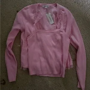 Soft ribbed knit tank with matching cardigan. Cardigan features delicate ruffle trim. Lightweight, feminine layering piece. Easy to style for many looks.