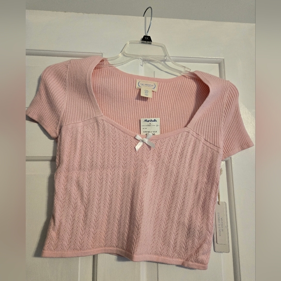 This stylish cropped, pink ribbed knit top offers a comfortable and chic look. Perfect for casual outings. It is new with tags and a size xl.