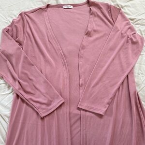 Comfortable pink ribbed lounge set. Includes a top, pants, and cardigan. Perfect for relaxing at home.
