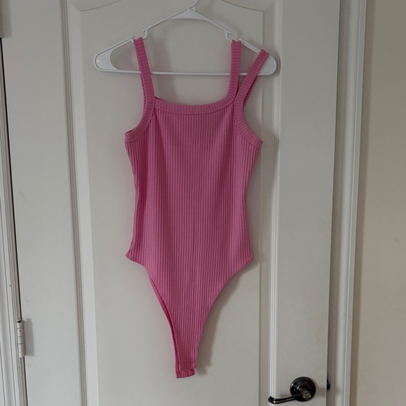 This stylish pink ribbed one piece is perfect for summer days or layering. Comfortable and trendy, it's a great addition to any wardrobe.