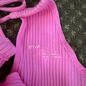 Stylish pink ribbed one-shoulder top with tie detail. Perfect for a chic look.