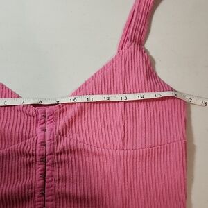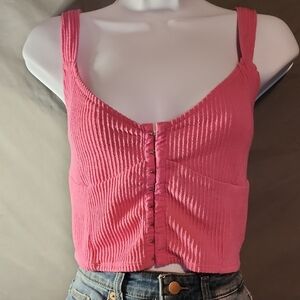 This stylish pink tank top features a ribbed texture and a ruched detail at the center front, offering a modern and chic look. The sleeveless design and cropped silhouette make it perfect for warm weather or layering. Its form-fitting style ensures a flattering fit, ideal for casual outings or a night out.