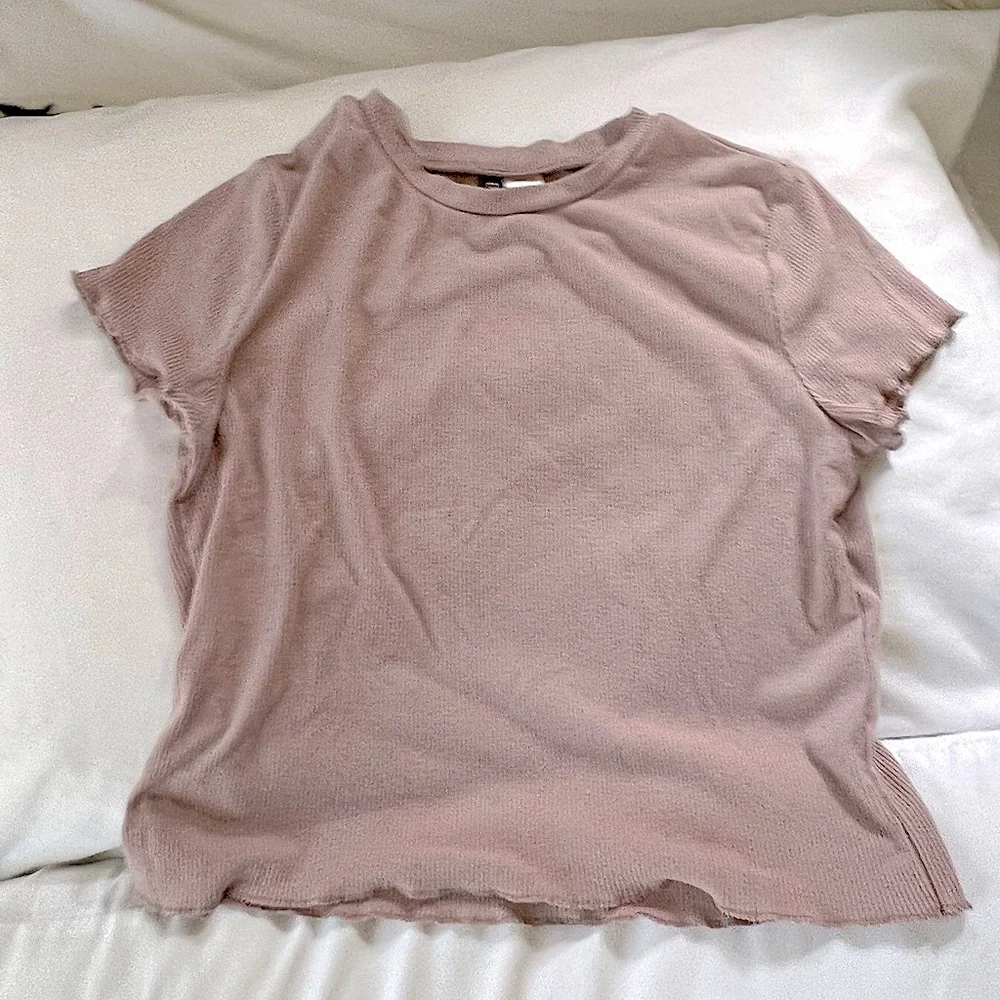 H&M mauve pink tee, cropped and lettuce edge on sleeves. Ribbed style. Fits like a Small/Medium.