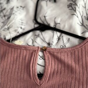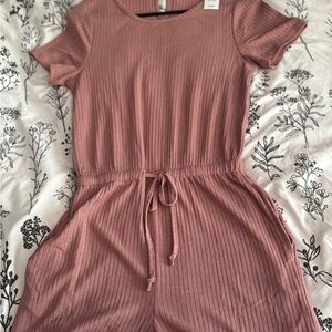 Stylish mauve ribbed romper with short sleeves and a drawstring waist. Has never been worn. Brand new with tags and ready to ship! Smoke free home