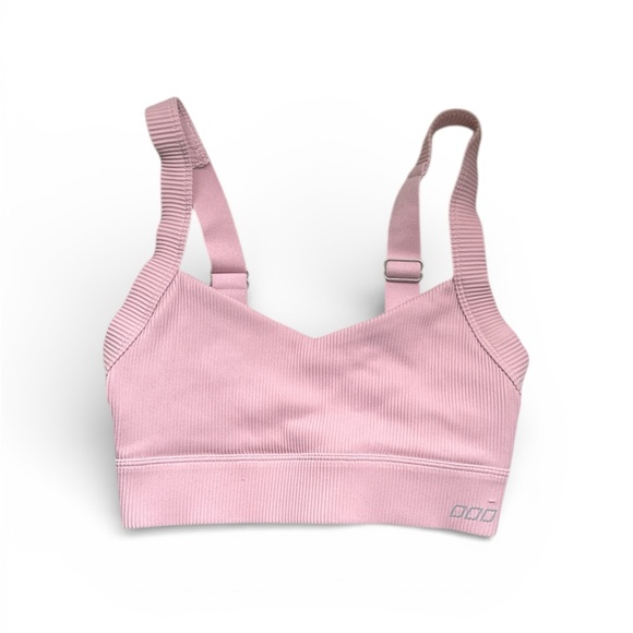 Stylish pink ribbed sports bra with adjustable straps. Perfect for workouts.