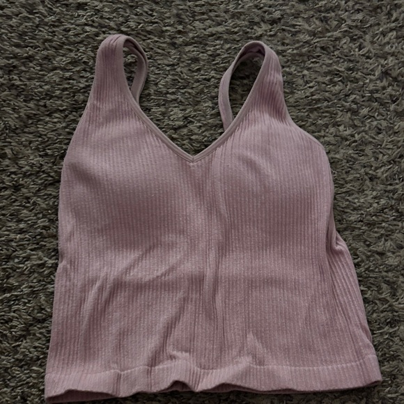 Stylish pink ribbed tank top with a V-neck design. Perfect for casual wear.