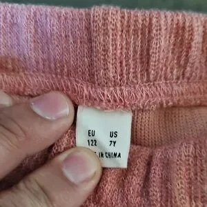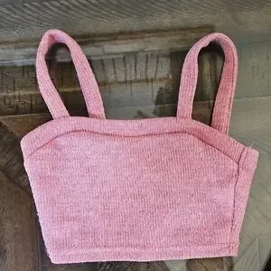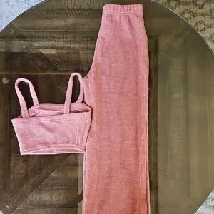Stylish pink ribbed two-piece set. Includes a crop top and matching pants. Perfect for casual outings.