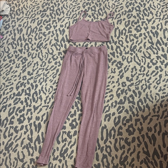 Stylish pink ribbed two-piece set. Includes a crop top and matching pants. Perfect for casual outings.