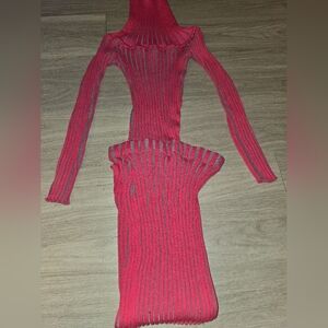 Stylish pink ribbed two-piece set. Includes a long-sleeve top and matching skirt. Stretchy Material