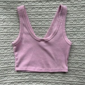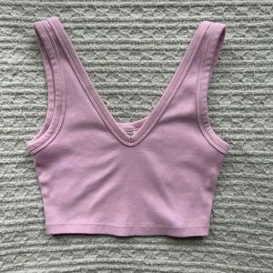 Baby pink, ribbed crop tank with a deep V neckline. Super soft and stretchy fabric makes it perfect for layering or wearing on its own. Pair it with jeans, shorts, or skirts for an easy everyday look!