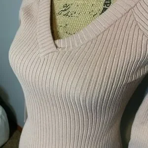 Stylish pink ribbed sweater with a flattering V-neck design. Perfect for any occasion.