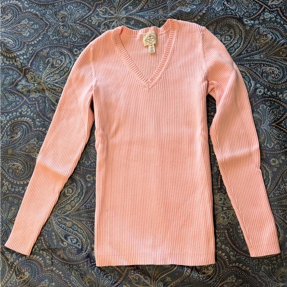 Chic light pink sweater with ribbed texture. Features a flattering V-neck, slim fit, excellent condition.
