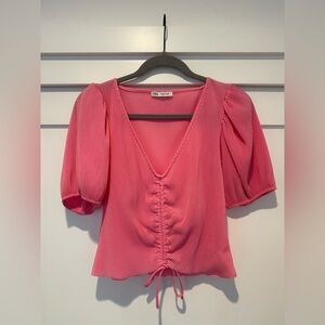 Stylish fuchsia blouse with puff sleeves. Features a V-neck and drawstring detail. Perfect for versatile wear.