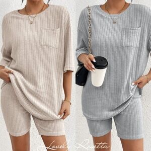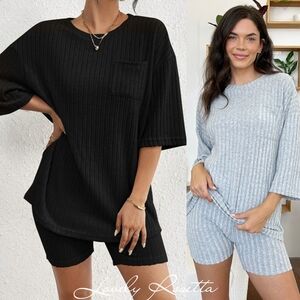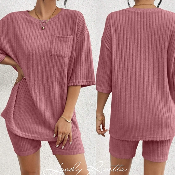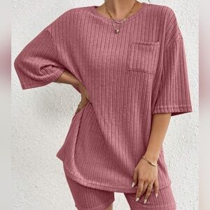 Stylish pink ribbed top with matching shorts. Features a front pocket and relaxed fit.