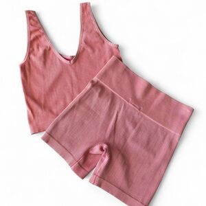 Experience comfort and style with this pink ribbed intimate set. Perfect for lounging, workout, or sleeping this set offers a soft and snug fit.