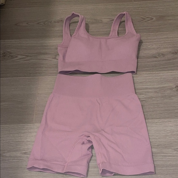 Stylish pink ribbed workout set. Includes a crop top and high-waisted shorts. Perfect for yoga or gym sessions. Padded bra.
