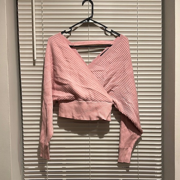 Elevate your style with this chic pink ribbed wrap top. Perfect for any occasion, this top offers both comfort and elegance. Excellent condition.