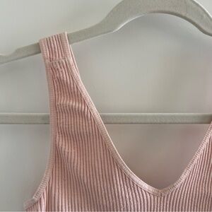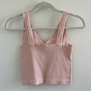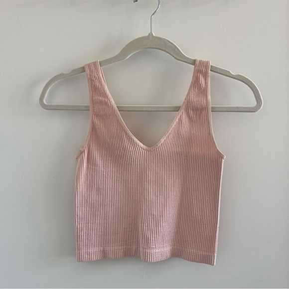 Stretchy pink ribbed tank top. Tight-fitting with a v-neckline and cropped fit. Brand is Nikibiki, one size but fits XS-medium best.