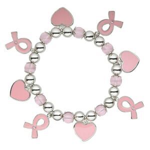 Bracelet, lead-safe pewter and enamel, pink and silver, 7-9mm round, heart charms and awareness ribbon charms, 7-inch stretch
