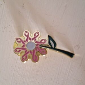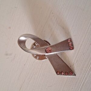 Pearl beads with pink enamel ribbon charms and elastic stretch band will fit most adult wrists. Two of the pins are Avon. Avon breast cancer ribbon pins in excellent condition. One style is accented with soft pink enamel. The silver style is accented with pink rhinestones. These are in excellent preowned condition.