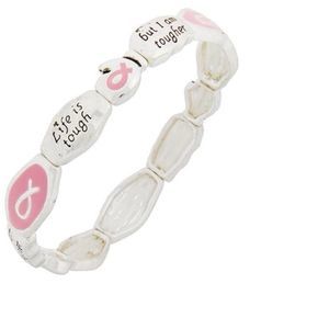Antique Silver Tone / Pink Epoxy / Metal / Message Card / Pink Ribbon / Stretch Bracelet