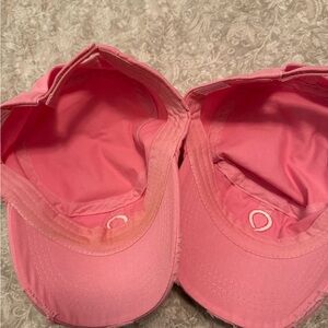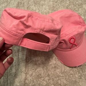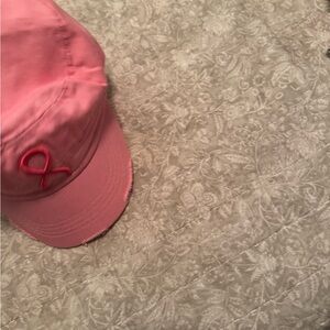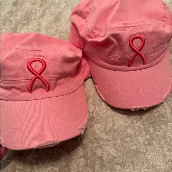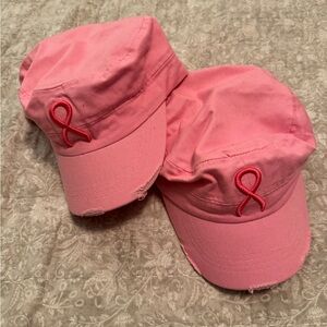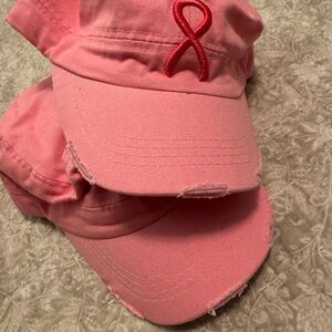 Set of two pink caps with embroidered ribbon design. Great for Breast Cancer Awareness. Adjustable and distressed look.