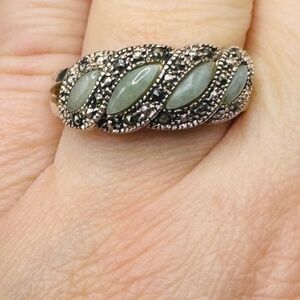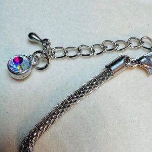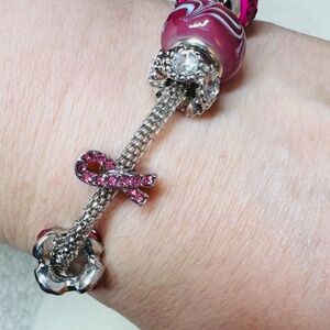 This is a beautiful silver tone bracelet. It has two pink rhinestone ribbon beads on either side of the pink rhinestone bead. There are two pink and white swirl beads. At the end is AB round crystal like stone! This is a beautiful bracelet to show your support.