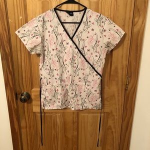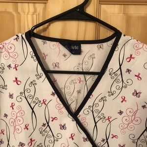 Breast cancer awareness pink ribbon scrub top with beautiful designs! There is a black string at the waist to tie to give it more shape to your body. Great condition! Size XS but feels more like a small.