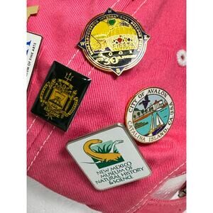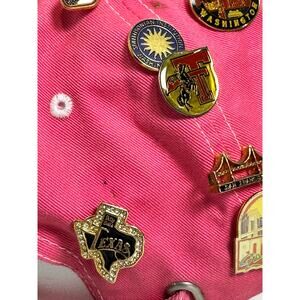 This pink Richmond, Virginia cap has 39 souvenir pins plus one Paul McCartney New World tour pin. All are in very good condition. Please see photos for pin identity. The cap is Landmark Grafics, one-size-fits-all with adjustable buckle back in very good condition. 4544.