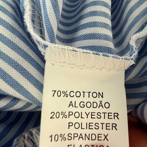 Stylish blue striped dress with button-up front. Features a ruffled hem and three-quarter sleeves.