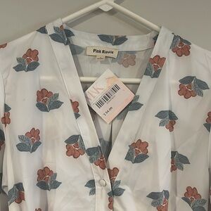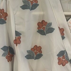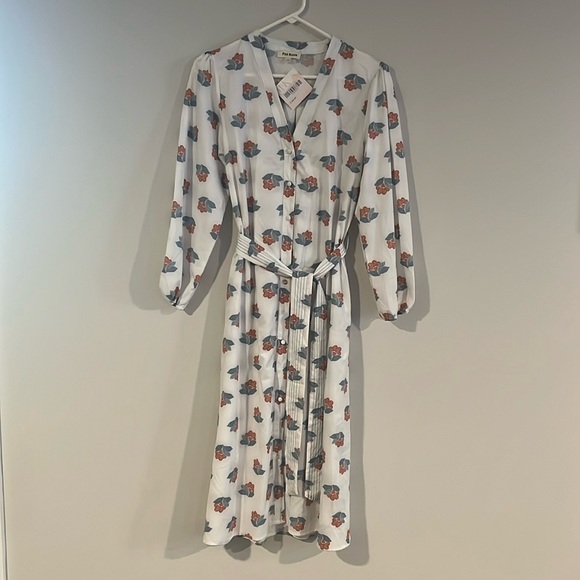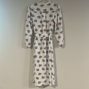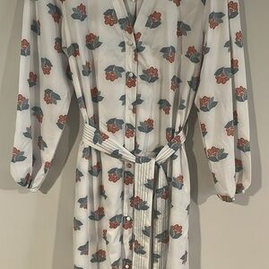 100% polyester midi floral print dress. Buttons down front with belt (can be removed). Does have small stain on front (see photos). NWT from Mulberry and King
