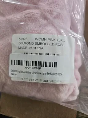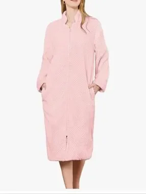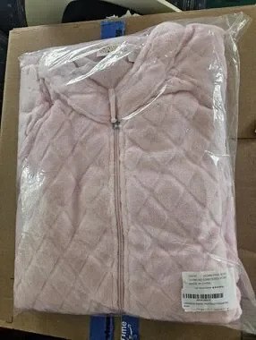 Soft plush zip-front robe in a pale pink hue. Long length with side pockets. Plush textured finish for extra comfort. Easy to slip on and wear around the house. Brand new in package. Size XL