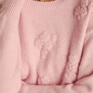 Pink Romantic Women's Pastel 3D Flowers Embroidered Long Sleeve Cute Sweater
