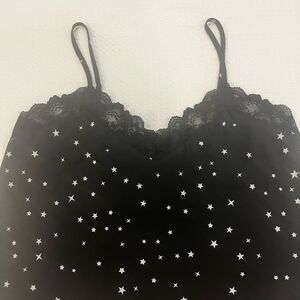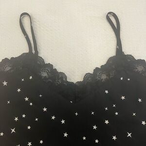 Chic black camisole featuring a star pattern. Accented with lace trim for elegance.