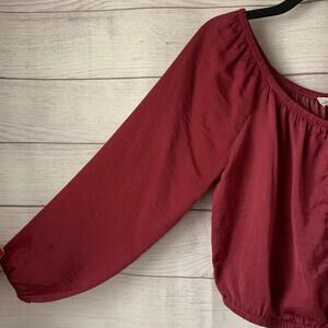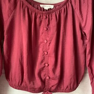 Dusty pink blouse by Pink Rose. This blouse has a wide neckline that can be worn on or off the shoulders. It has long sleeves with elastic band cufs, decorative button detail down the front with a decorative tie string at the bottom, and elastic bands along the neckline and bottom hem. It is pre-owned with a spot on the front right arm, but is otherwise in great condition
