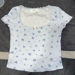 This elegant Pink Rose blouse features a fitted style with a square neckline adorned with white lace trim. The short sleeves and delicate floral pattern in blue hues add a touch of vintage charm to this stylish top.