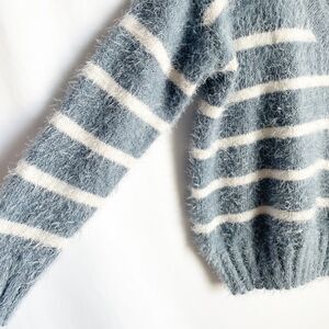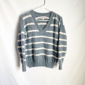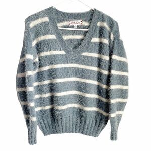 Super soft, grayish blue, with white stripes, fuzzy knit V Neck Sweater. Excellent preowned condition, no rips stains or tears. Measurements laying down
