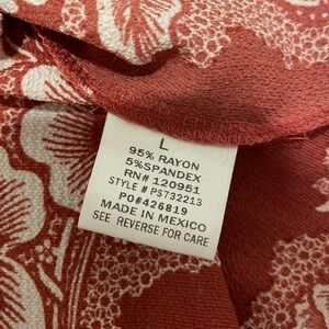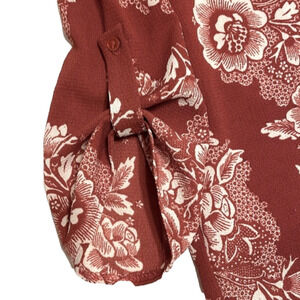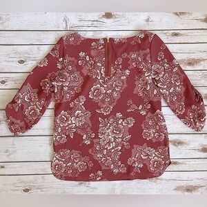 This dusty rose blouse with white/cream floral details has a functional zipper closure in the back. 3/4 sleeves cinched with buttons. Junior L, so it fits more like a Women’s Medium.