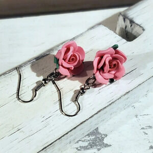 Pink Rose Flower Handcrafted Fimo Polymer Clay Bead Dangle Earrings