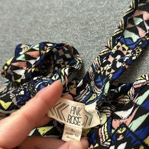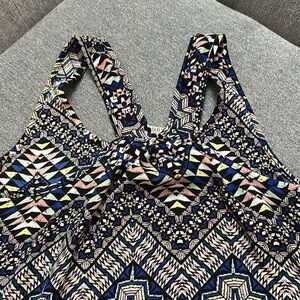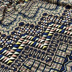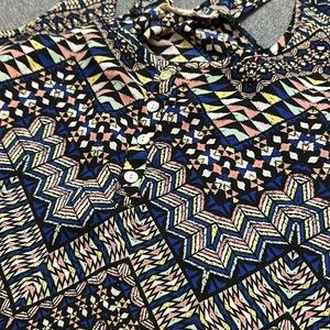 This beautiful tank is full of vibrant colors and an awesome geometric design. Royal blue, pink, seafoam green, yellow, white color markings. Thin material for a good breeze in that summer heat. Pit to pit measurement 18”, length shoulder to bottom 23”