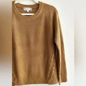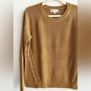 Cozy gold sweater with cable knit details. Perfect for layering.