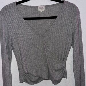 Discover the elegance of the Pink Rose Gray Ribbed Wrap Blouse, featuring a sophisticated wrap design and long sleeves. Crafted from a soft, stretchy ribbed knit, this blouse offers a flattering fit and versatile style. Perfect for both casual outings and more refined occasions, it seamlessly blends comfort with chic fashion.