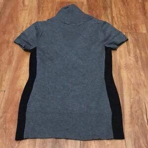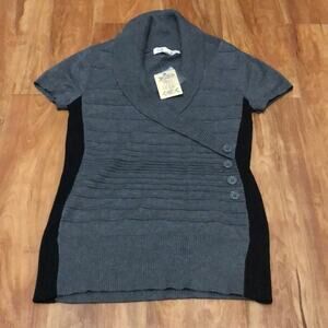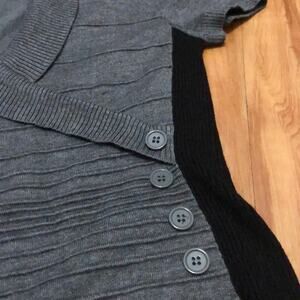Pink Rose Gray and Black Top Size Small (Juniors). Dark gray and ribbed on the front with black on the sides. Four buttons on the side with a collar that can be turned down. Approximately 15.5 inches armpit to armpit and 24 inches in length. Rayon and polyester blend.