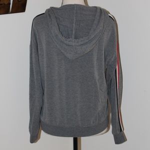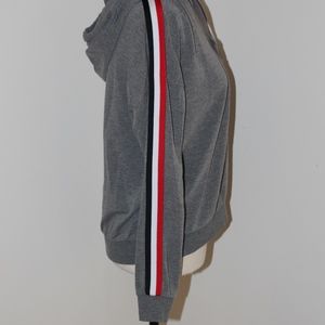 - Heather grey sweatshirt with black, white and red strips down both sleeve