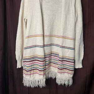 Super soft, cute wrap. Poncho like style. Cream colors with stripes and fringe. It's a juniors large and snug on me, in the arms. So it's more of an xs in grown up sizes.