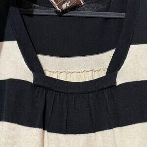 A versatile sweater dress with bold black and cream stripes, a flattering square neckline, and handy front pockets. The soft cotton-blend knit has just the right amount of stretch for comfort and shape. Perfect for layering or wearing solo, this dress is a stylish go-to for casual outings or work-to-weekend wear.