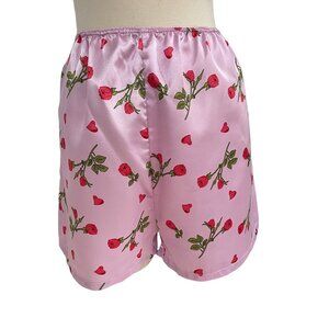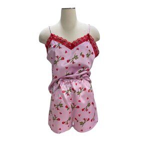 Slip into something effortlessly cute and comfortable with this Jolie Intimates pink satin pajama set. Featuring a cami top with delicate red lace trim and adjustable spaghetti straps, paired with matching high-waisted shorts, this sleepwear ensemble is adorned with a charming red rose and heart print throughout. Made of 100% polyester satin, it offers a soft, silky feel perfect for lounging or sleeping. The playful Valentine’s aesthetic makes it an ideal gift for self-care nights or special occasions.