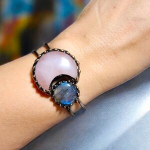 Natural stone bracelet, pink quartz jewelry, moon cuff bangle, labradorite bracelet, boho chic cuff, artisan gemstone jewelry, celestial vibes, moon jewelry, crystal healing bracelet, gift for her, rose quartz cuff, cosmic style, spiritual bracelet, metaphysical stones, handmade fashion accessory, earthy tones, bohemian jewelry, seasonal spring fashion, trendy 2025 bracelet, astrology jewelry, cosmic moon cuff, Mother's Day gift idea, spring fashion accessory, summer jewelry trends, boho spring style, festival season bracelet, spring gifting, spring moon bracelet, crystal vibes for spring, moon