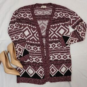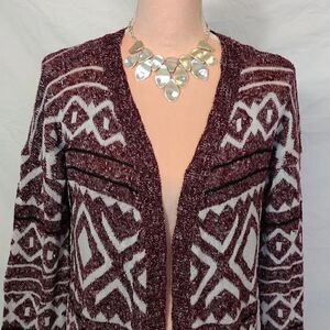 Red (or burgundy) with black & white knitted in, tribal prints. Open front. Long sleeves. 2 front, square pockets. Long, sits between waist & knees (depending on height). Super soft & comfy! Stretchy. Perfect for Fall weather!