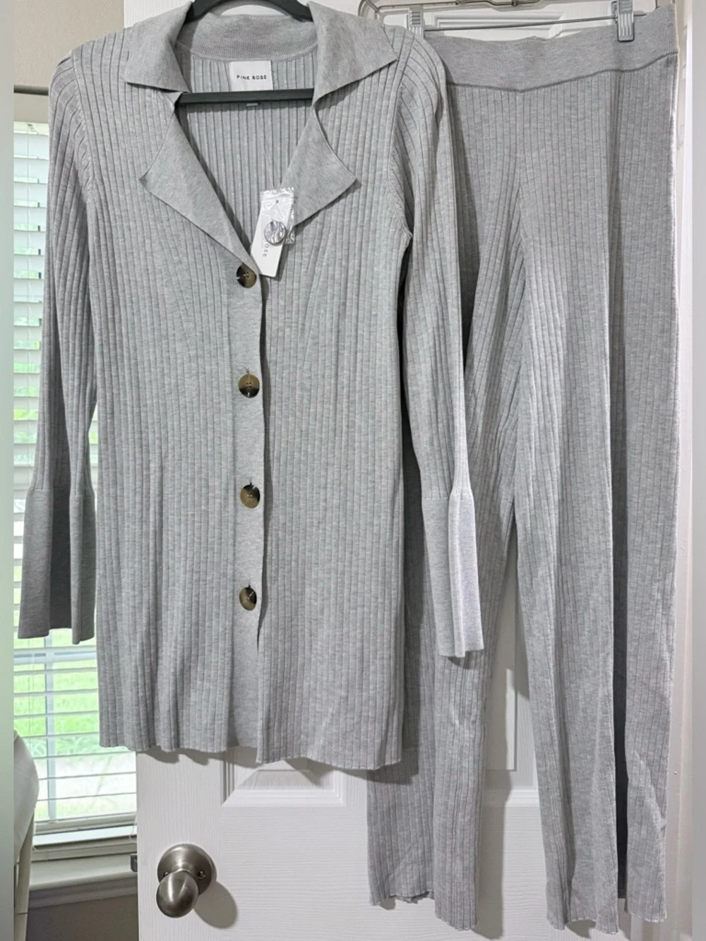 Two-piece ribbed knit set with button-front longline top and matching straight-leg pants. Ultra soft, lightweight knit. Classic light gray color. Versatile and cozy for everyday wear.
